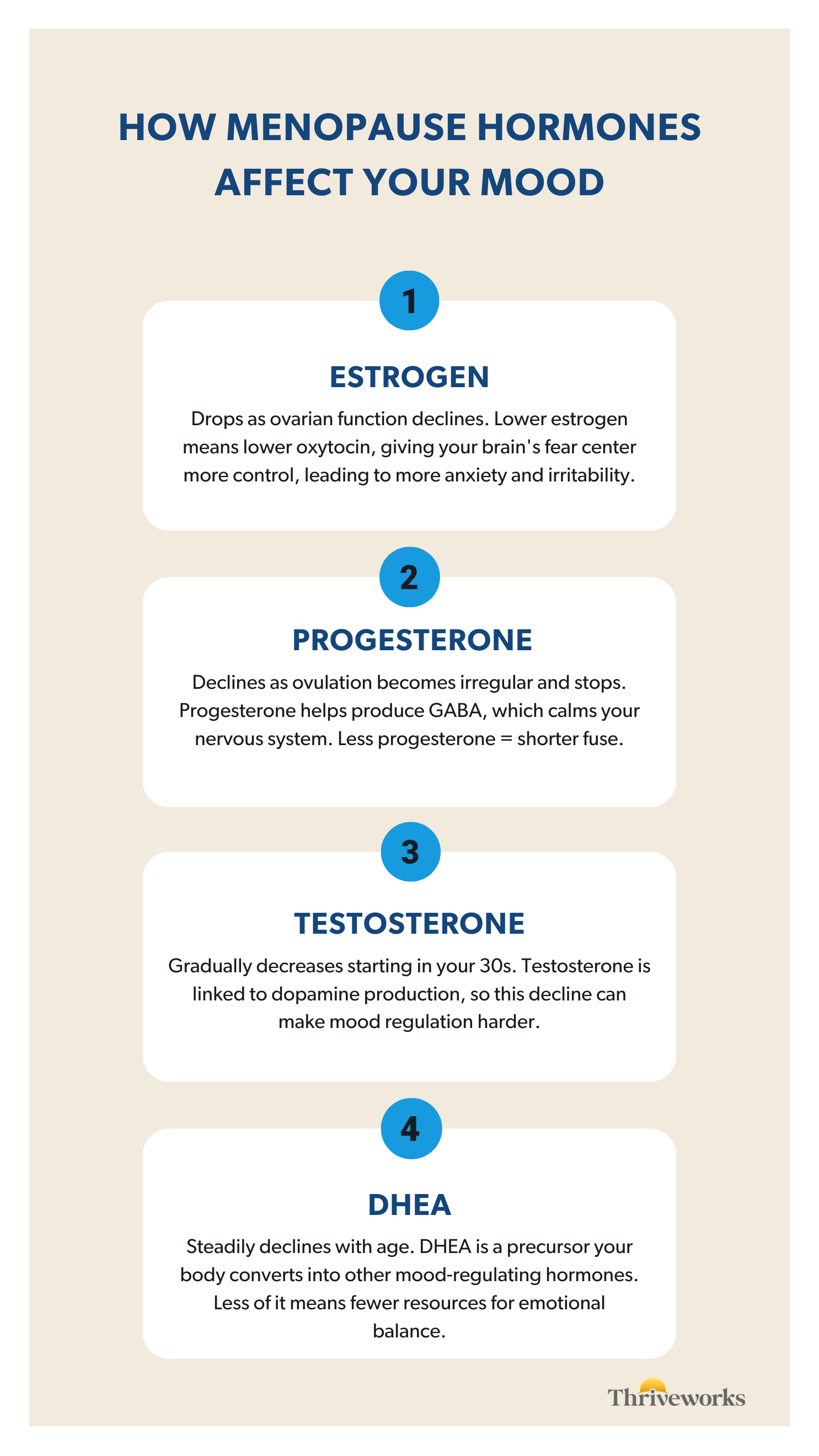 The barista forgets the almond milk and it feels like a personal attack. Your partner chews too loudly and you immediately want to leave the room. These flashes of irritation aren’t like you, but lately, they’re constant. This often comes down to hormonal changes from a life transition no one really prepares us for. And this irritation frequently lands on partners: Nearly one in four people going through menopause, and an even higher percentage of their partners, say it strains their relationship. If you’re wondering what’s wrong with you (or your relationship), the answer is nothing, exactly. But the way your brain regulates emotions does change during menopause, and understanding why can help you manage it. Some couples say the tools they develop during this time actually make their relationship stronger. “Menopause is a profound transition that impacts identity, relationships, and emotional health,” says Anat Joseph, LCSW, a therapist in New York and New Jersey who specializes in relationship challenges. “With the right support, it can be navigated in a way that fosters growth and deeper connection.” Here, we break down what’s really happening, and what you can do about it. Key takeaways Menopause anger is biological, not personal. Declining estrogen, progesterone, testosterone, and DHEA directly affect how your brain regulates emotion. Snapping at your partner often means you feel safe with them. You’re more likely to let your guard down with someone you trust. Partners don’t need to become hormone experts. But learning the basics, splitting the mental load more evenly, and listening to understand (not fix) can make a real difference. Hormone therapy can help. If mood changes are significantly affecting your life or relationships, HRT is a proven option worth discussing with a doctor. Why menopause can make you feel so angry Menopause anger isn’t all in your head. It’s rooted in measurable hormonal shifts that directly affect how your brain regulates emotion. During the menopausal transition (the two to eight years leading up to when your period stops for good), production of several key hormones decreases significantly. “Menopause sees a complete depletion in the major sex steroid hormones: progesterone, DHEA, estrogen, and testosterone,” says Kristin Mallon, CNM, co-founder and medical advisor for Femgevity. Here’s what happens to each of these hormones during menopause and how those changes affect your mood: Estrogen As ovarian function declines, estrogen production drops significantly. This matters for mood because estrogen helps regulate oxytocin, a hormone that promotes feelings of calm and connection. Lower estrogen means lower oxytocin—and that gives your amygdala (your brain’s fear-response center) more control over your nervous system. The result: feelings of anxiety, depression, and irritation can surface more easily and intensely than before. Progesterone Progesterone is produced primarily by the ovaries after ovulation. As ovulation becomes irregular and eventually stops during menopause, progesterone levels decline. This affects mood because progesterone helps produce GABA, a neurotransmitter that calms your nervous system. When progesterone drops, GABA can too. “That means a shorter fuse,” Mallon explains, “and it’s often pointed at the people we feel safest with.” Testosterone Testosterone (yes, people with ovaries produce it too) is made by both the ovaries and adrenal glands. Production gradually declines starting in your 30s and continues through menopause. Since testosterone is linked to dopamine production (a neurotransmitter that regulates mood and motivation), this decline can make mood regulation harder. DHEA DHEA is a precursor hormone produced by the adrenal glands that your body converts into estrogen and testosterone. Its production peaks in your 20s and steadily declines with age, dropping more noticeably during menopause. Lower DHEA means less raw material for other mood-regulating hormones, which can increase the risk of depressive symptoms. Is it normal to resent your husband during menopause? Yes, and it often means your relationship is strong. Feeling safe enough to let your guard down with someone means you’re also more likely to snap at them. “We feel safest with our partners, and this is where we can most easily break down,” Mallon explains. You snap at your partner because you feel comfortable around them, which is actually a key ingredient for a healthy relationship. The flip side: These emotional shifts can strain even solid relationships if they go unaddressed. “With the closeness comes the illusion that a person will endlessly tolerate us, and it feels like a safe outlet for our volatile emotions during menopause,” Mallon adds. For some, it’s the opposite: snapping is followed by a wave of guilt or fear that you’re pushing your partner away. Some people also report other reasons for resentment during this time: feeling misunderstood, watching their partner seem less impacted by age-related changes, or sensing that their partner buys into societal stigma about menopause rather than truly understanding what’s happening. How to manage menopause-related anger Here’s what therapists recommend: 1. Identify your triggers. There’s usually a trigger behind anger: your partner running late, a dismissive comment, an uneven mental load. Tracking these in a mood journal helps you spot patterns and respond differently over time. Joseph recommends noting triggers as soon as they happen, whether that’s a quick entry in your phone’s Notes app or a dedicated journaling session. Over time, you’ll start to see what sets you off, and you can work on either avoiding those triggers or changing how you respond. 2. Use “I” statements to avoid blame. How you express your feelings matters. “Phrases like, ‘I’m noticing my emotions feel more intense right now, and I need your patience,’ o